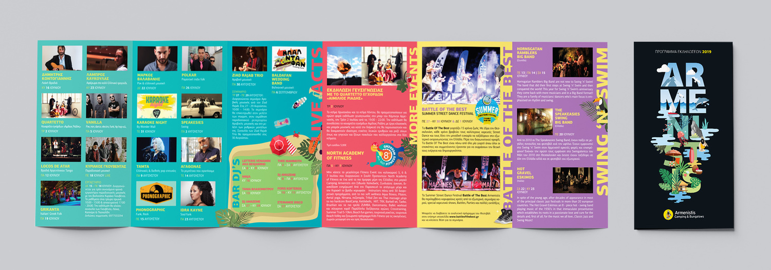 Lineadesign Studio has skillfully crafted a fresh brand identity for Armenistis Camping and Bungalows’ annual event program. Evolving into one of Chalkidiki’s premier summer festivals, this event boasts an impressive lineup of major music bands, a diverse array of fitness activities, and lively dance nights. What sets it apart is its inclusive and welcoming atmosphere, appealing to a broad audience.