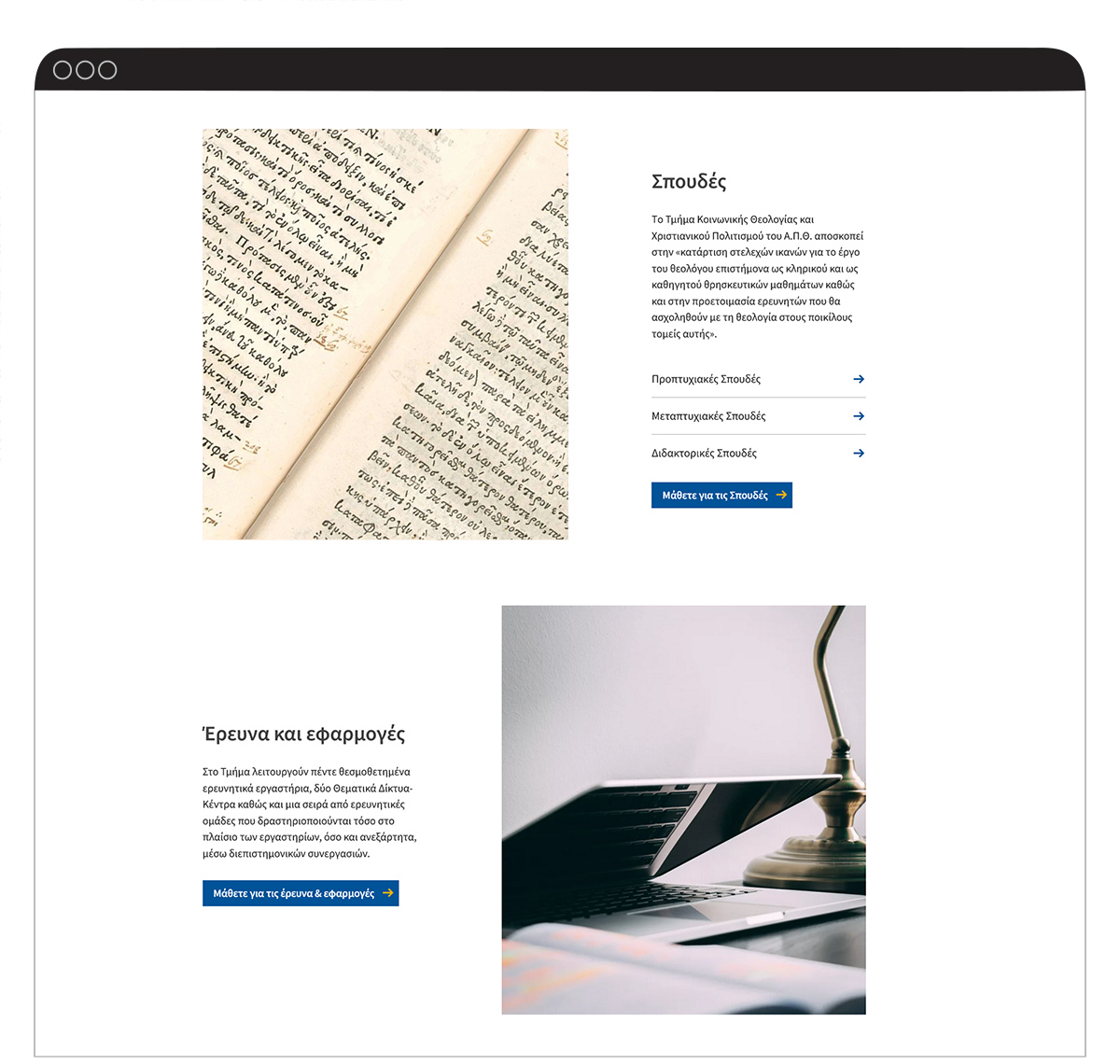 Η Σχολή Κοινωνικής Θεολογίας και Χριστιανικού Πολιτισμού χρειάστηκε έναν νέο ιστότοπο που να προσφέρει εύκολη πρόσβαση σε πληροφορίες, να προωθεί το ακαδημαϊκό πρόγραμμα και να ενημερώνει τους φοιτητές για το τελευταίο πρόγραμμα σπουδών, τα νέα και τις εκδηλώσεις. Ο δικτυακός τόπος σχεδιάστηκε με μια καθαρή, απλή και λειτουργική διάταξη που παρουσιάζει το πιο σημαντικό περιεχόμενο με τρόπο εύληπτο και προσβάσιμο για όλους τους χρήστες. Η αρχική του σελίδα περιλαμβάνει ένα slider, έντονη τυπογραφία και ελκυστικές εικόνες, καθώς και κουμπιά με χρωματική κωδικοποίηση που οδηγούν σε σημαντικές πληροφορίες σχετικά με τη σχολή, το πρόγραμμα σπουδών και τους μαθητές. Αυτά τα κουμπιά με χρωματική κωδικοποίηση επιτρέπουν στους επισκέπτες να περιηγηθούν εύκολα στον πλούτο των διαθέσιμων πληροφοριών και να βρουν αυτό που αναζητούν πιο γρήγορα και αποτελεσματικά. Συμπυκνώσαμε και οργανώσαμε τόνους πληροφοριών σε συνεκτικές και εύκολα πλοηγήσιμες σελίδες. Η δομή του ιστότοπου μπορεί εύκολα να αλλάξει από το προσωπικό, τα μενού προσαρμόζονται αυτόματα στη δομή. Ο ανταποκρινόμενος ιστότοπος που προέκυψε περιλαμβάνει ένα ημερολόγιο εκδηλώσεων όπου οι επισκέπτες μπορούν εύκολα να έχουν πρόσβαση σε επερχόμενες και παρελθούσες εκδηλώσεις.